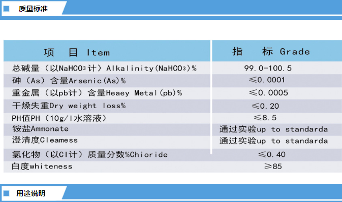 產品用途:碳酸氫鈉俗稱小蘇打,產品呈白細小晶體,無臭、咸味。
